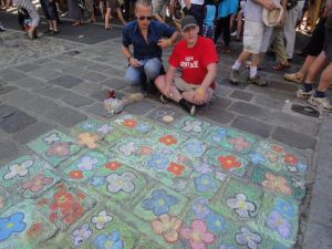 [[Bestand:Jackjohannes-Hemp-Franky-Bordo-cafe-Volkshuis-Droef.png|miniatuur| | [[Bestand:Jackjohannes-Hemp-Franky-Bordo-cafe-Volkshuis-Droef.png|miniatuur|Jackjohannes Hemp (links) en [[Franky Bordo]] (rechts) tijdens [[Droef Veto]] in café [[Het Volkshuis]]. Foto: [[Philip Volckaert]].]]JackJohannes Hemp maakte op diverse gelegenheden grote bloementekeningen met stoepkrijt, vaak ook performancegewijs, bijv. in symbolische kostuums of in een kunstzinnige setting met andere spelers. Een bijzonder hoogtepunt was zijn passage op het 'Festival International de Théâtre de Rue d'Aurillac' in 2011. Jack was aldaar verantwoordelijk voor de security tijdens voorstellingen van 'Guard Avant', een controversiële performance van [[Bob Minne]] en [[Iris Blomme]]. In zijn vrije uren trakteerde hij het festival op een enorm bloementapijt van krijt. Bloemen stonden ook in zijn dicht- en schilderwerk vaak centraal. | ||